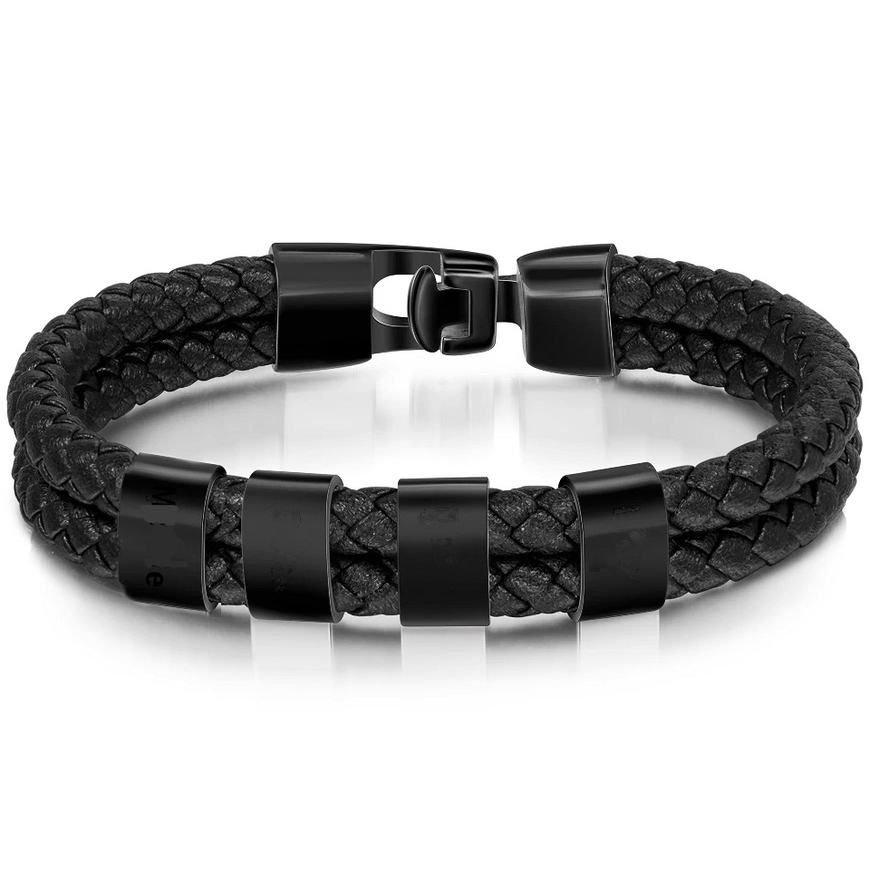 Superb black braided leather bracelet with small stainless steel rectangles personalized with the first names or words of your choice. A perfect gift for the gentleman!