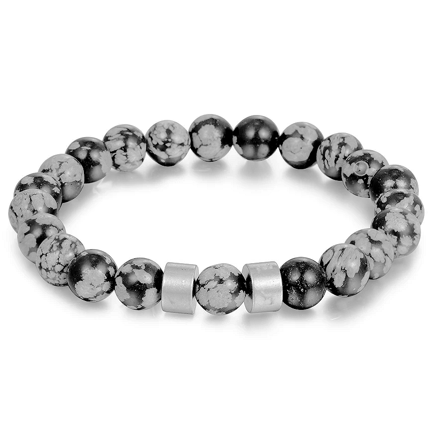 Superbe bracelet unisexe en pierres semi-précieuse OBSIDIENNE SNOWFLAKE personnalisé avec 2 petits tags couleur argent pouvant recevoir une gravure de votre choix.